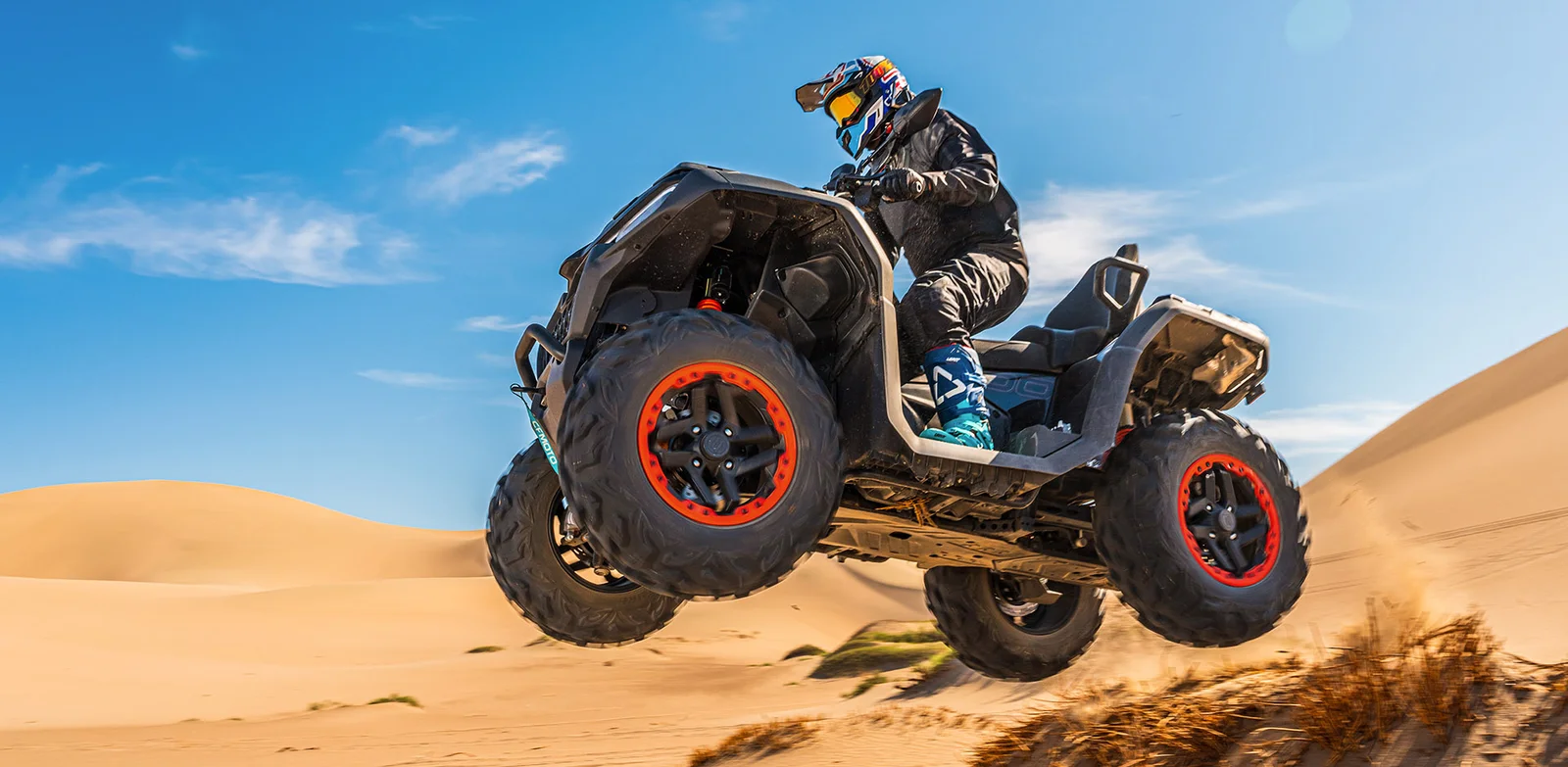 Ahora con un 35% más de recorrido de suspensión y un ángulo de giro 17% más cerrado, la suspensión delantera de doble brazo en A y la trasera de brazo basculante independiente ofrece mejores prestaciones manteniendo una conducción más suave incluso en los terrenos muy difíciles. Con amortiguadores totalmente ajustables, podrás personalizarla totalmente para adaptarla a tus necesidades, ya sea con cargas más ligeras o para viajar con pasajero.